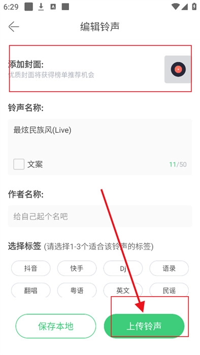 5、最后,只需要给音频增加一个封面和介绍,就能直接上传铃声。