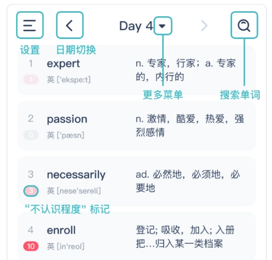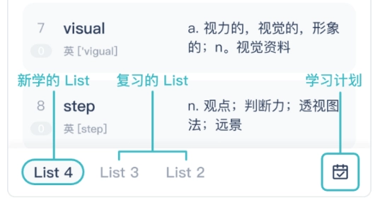 学习页面,进入到 Day2,中间显示当前 List 的所有单词,其他区域如图所示;