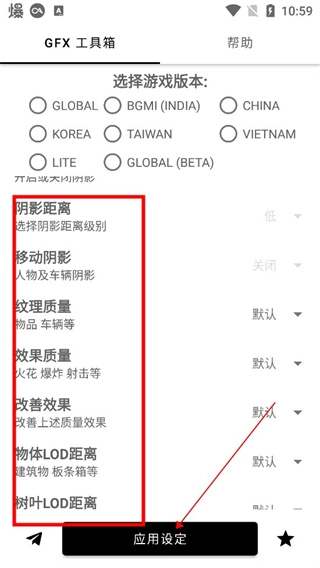 5、在gfx画质助手内还可以设置抗锯齿、阴影、纹理等多种数据修改,在设置完成后,点击底部“应用设定”既可开始体验啦!