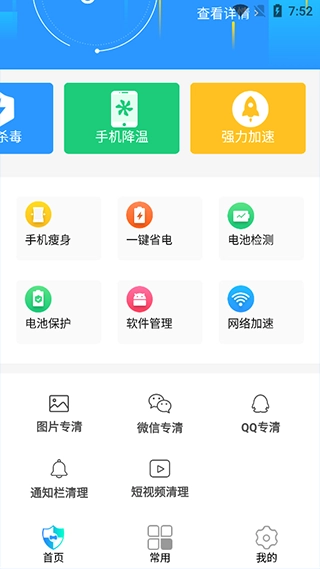 3、首页处下拉至底部还能够对微信、qq等专门的手机应用进行缓存清除