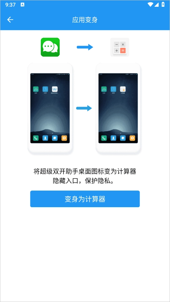 3、可以使双开助手桌面图标变为计算器隐藏,点击“变身为计算器”即可实现。