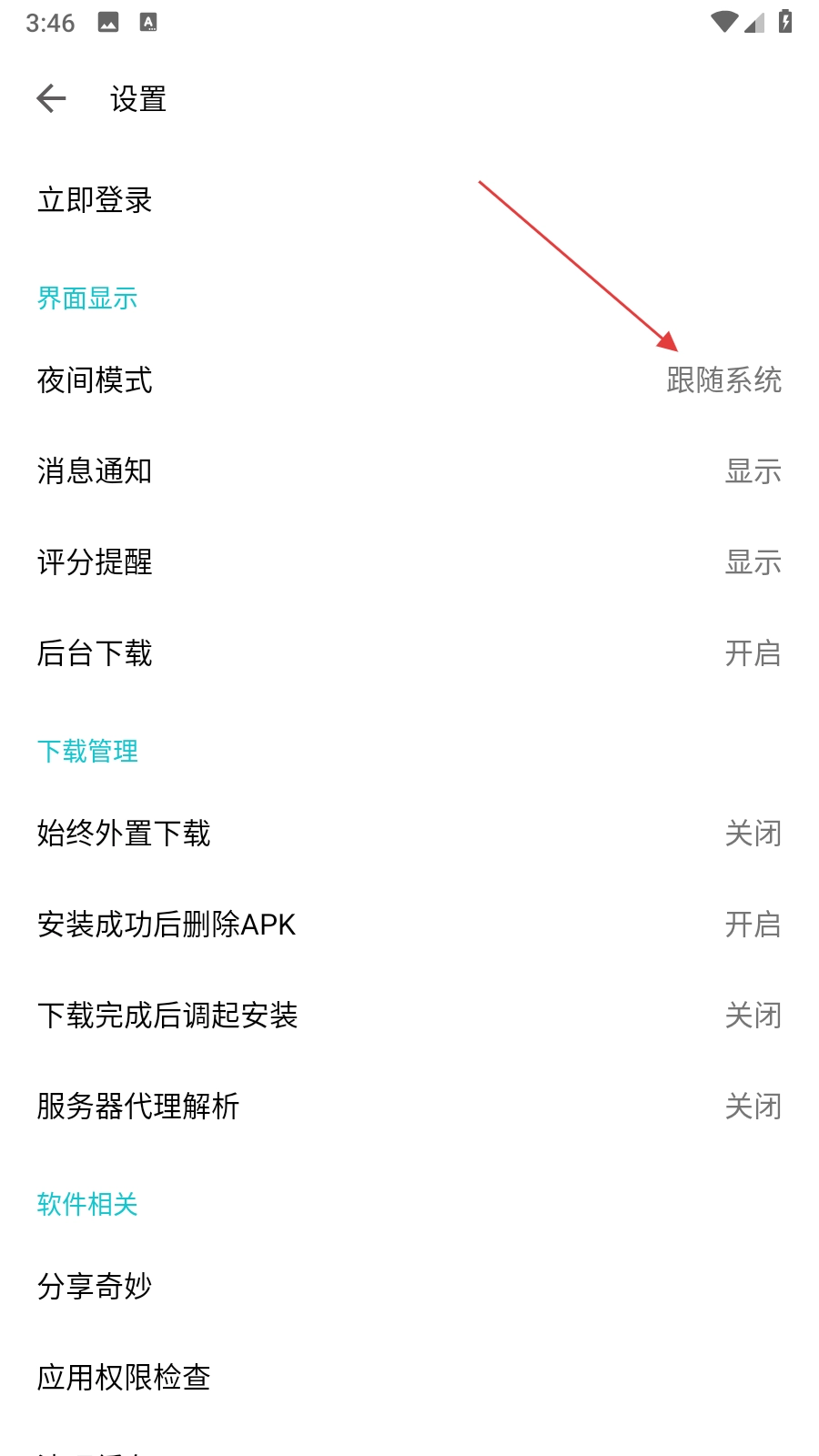 2、进入设置页面后,找到界面显示分类里的夜间模式选项,点击该选项,把它切换成自行切换的状态。