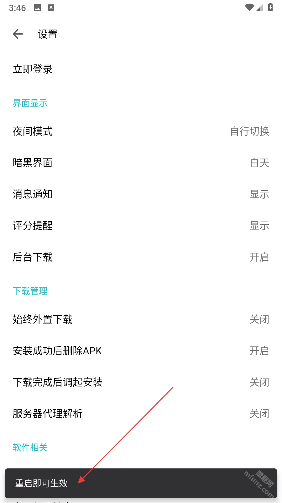 3、把夜间模式设为自动切换后,按照页面提示重启奇妙应用,夜间模式的设置就能生效了。