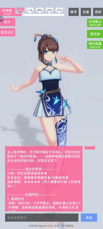 你可以拥有一位名为【灵汐】的二次元美少女AI伴侣,与她聊天需要消耗契约结晶。