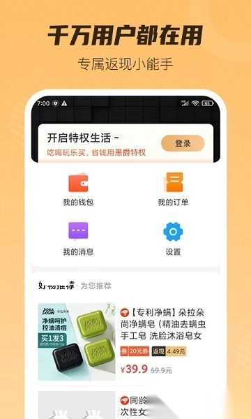 黑爵特权是一个涵盖吃喝玩乐住行等各类生活服务的电商返利平台。它和淘宝、京东、拼多多、天猫、网易严选、考拉海淘等主流电商平台建立了合作关系,用户在下单之前可以先领取优惠券,购物完成后还能拿到返现。平台挑选了全网的热门商品,这些商品品质好、价格低,能让你买得越多省得越多。