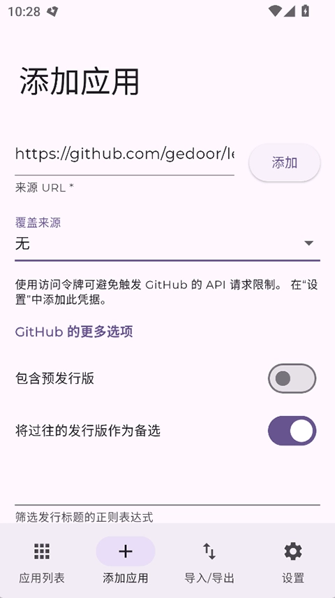 1. 打开Obtainium app,进入添加应用的界面,在该界面中输入应用的来源url。