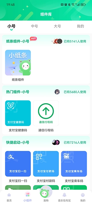 用户在小组件页面能够设置热门、快捷启动、纸条等各类小组件,并且还能选择大号、中号、小号这三种尺寸规格。