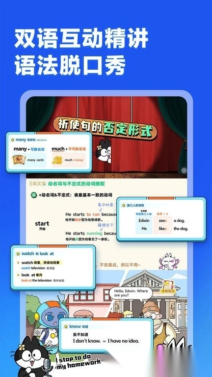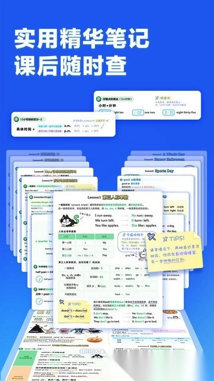 为攻克语法学习的难点,该应用创新打造了语法脱口秀形式,借助幽默的情景设定与轻松的对话互动,帮助孩子直观理解语法规则。同时,每课语法知识点都配备了精炼的语法笔记,便于孩子随时回顾复习,进一步巩固记忆。