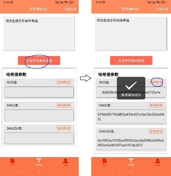 输入任意文字内容后,点击“生成字符串哈希值”按钮,系统会立即输出对应的MD5结果;同时还支持一键复制功能,方便直接使用。