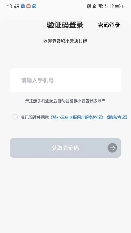 银小云店长版安装到手机后,输入手机号并获取验证码就能登录。