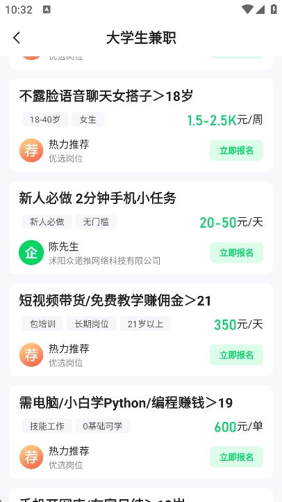 用户挑选到心仪的岗位后,点击“立即报名”按钮,就能联系人事洽谈兼职工作事宜。
