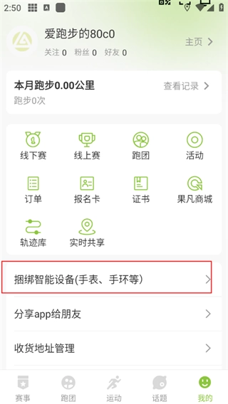 打开登录账号后进入软件的赛事页面,接着选择“我的”功能选项,然后点击“捆绑智能设备”。