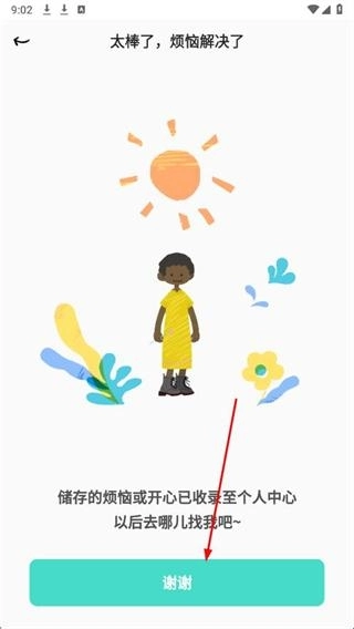 最后在“太棒了,烦恼解决了”页面,点击“谢谢”按钮,就能完成整个烦恼解决流程,相关记录也会自动收录到个人中心里。