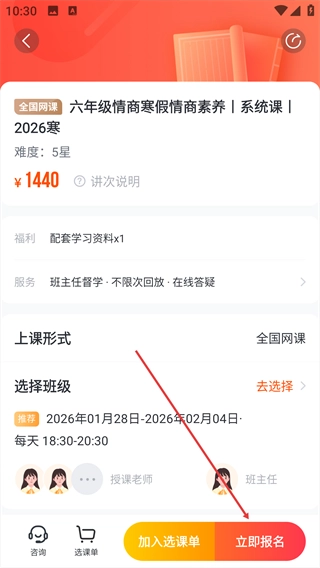 选好上课的日期、时间以及授课老师后,点击页面底部的【确定】按钮,即可完成报名流程。
