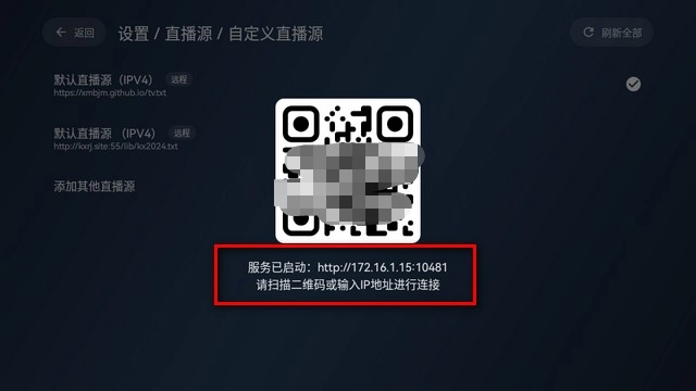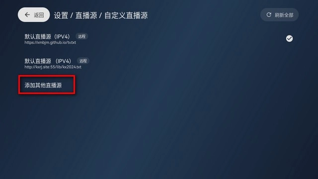 你会看到默认存在的两个源,这时点击“添加其他直播源”按钮。