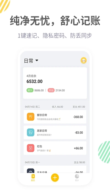 一键记账对收支记录进行了优化:借助快捷输入功能,用户能够快速记录消费金额、分类以及备注,无需复杂的操作步骤,显著提高记账效率,以适应快节奏生活的需求。