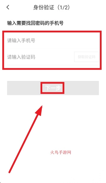 请先输入用于注册的手机号码以及您收到的验证码,随后点击“下一步”按钮,就能进入重新设置密码的环节了。