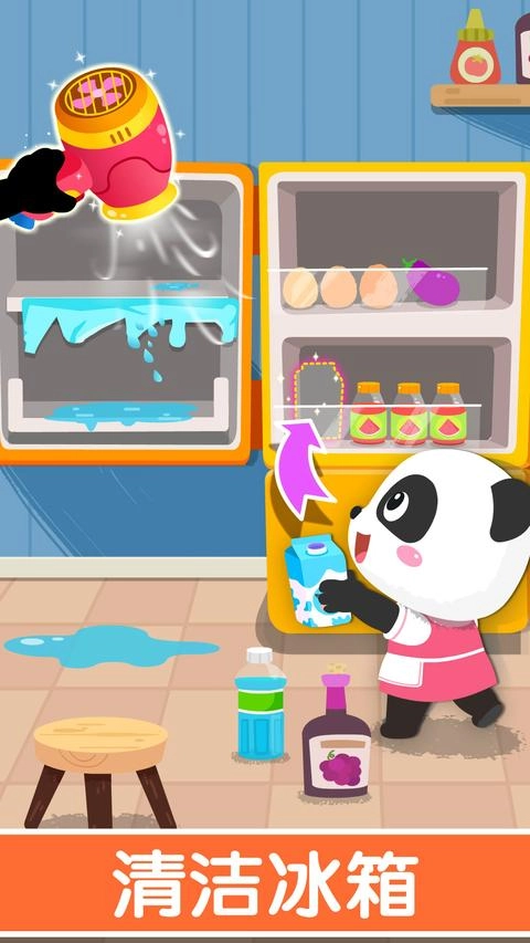 冰箱里结了厚厚的冰,已经没法放东西啦。得先把冰块清理干净,再把水擦干,然后把饮料、肉类、蔬菜这些食材分类整理好哦!(这样能锻炼宝宝的归类整理能力呢)
