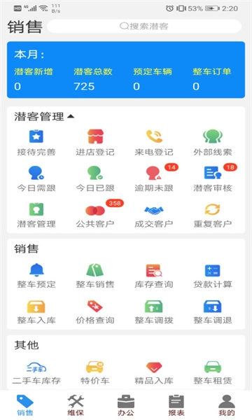 销管佳作为一款汽车营销综合管理系统,设有首页、维保、办公、报表、我的等功能板块,全面覆盖汽车专营店经营管理的各类需求,有需要的朋友欢迎前来体验。