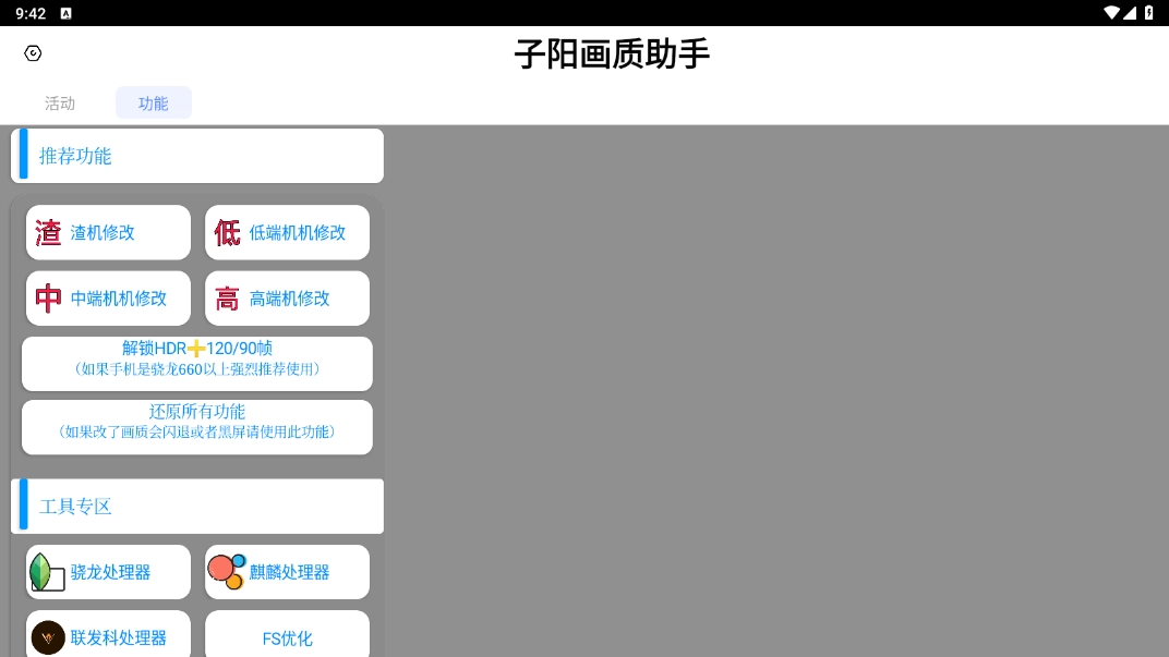 子阳画质助手是一款优秀的游戏画质提升工具,用户可以自主调节画质分辨率、各类参数和帧率,不断优化游戏画面表现,实现理想的显示效果,所有功能均免费开放,在游戏时能带来更优质的视觉体验,助力玩家更精准地完成瞄准与射击动作。