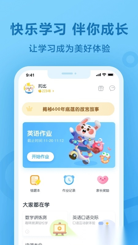这款应用是专门为小学生打造的,能提供在线听力练习、口语学习以及速算训练等功能。它和学校的教学进度贴合得十分紧密,覆盖了练习、评测等多种使用场景。并且,通过运用大数据与人工智能技术,它既能帮助教师减轻工作负担、提高教学效率,又能激发学生的学习兴趣,还能让家长更清晰地了解孩子的学习情况,让学习的过程变成一种愉快的体验。