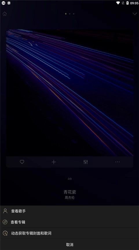 在播放界面中,还设有均衡器、收藏功能,以及查看歌手、查看专辑、动态获取专辑封面和歌词等选项。
