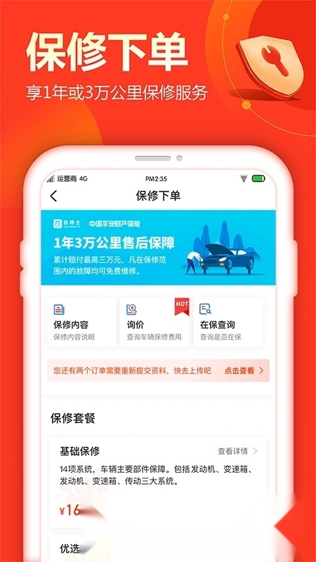 车辆保修:保障范围包括发动机机械系统、控制系统、进排气系统及差速器等核心部件;针对不同车况提供多种保修套餐,每台参与保修的车辆均向保险公司投保,车主可凭保单号查询承保信息。