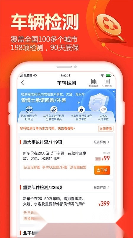 车辆检测服务涵盖上门检测与异地检测两种类型;查博士在全国众多城市布局了线下检测站点,拥有500多位专业检测人员,借助专业设备与智能系统,可完成102项本地检测项目或198项异地检测项目,并且支持实时操作流程。