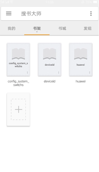 首先在手机上打开搜书大师应用,进入书架界面后点击界面上的“+”号图标。