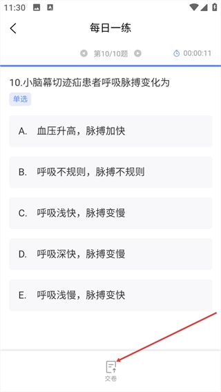 所有题目完成后,点击页面底部的【交卷】按钮,就能提交你的作答内容,同时查看练习结果。