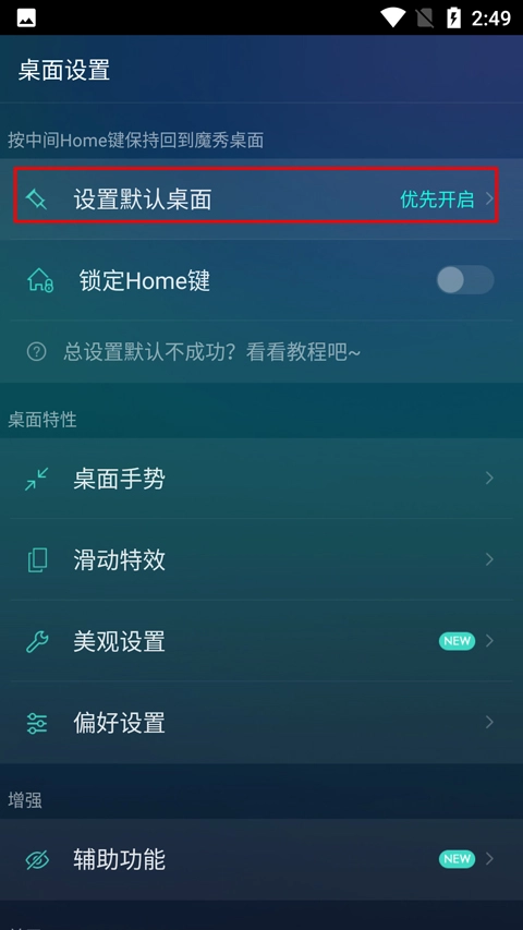 默认魔秀的设置方式是:在桌面上长按并向上滑动,就能完成默认桌面的设置啦,这样还能锁定手机的home键,桌面就不会丢失咯。