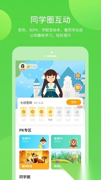 同学圈:设有签到打卡、PK对战、配音绘本学习以及同学动态分享等功能,让学习过程变得更有趣味。