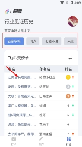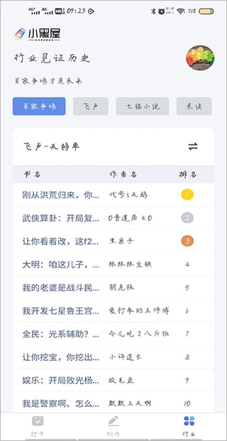 进入行业界面后,你会看到百家争鸣、飞卢、米读等各类小说阅读平台的集合,下方则展示着榜单中的书名与作者信息,用户可以根据自己的喜好,选择浏览他人的作品。