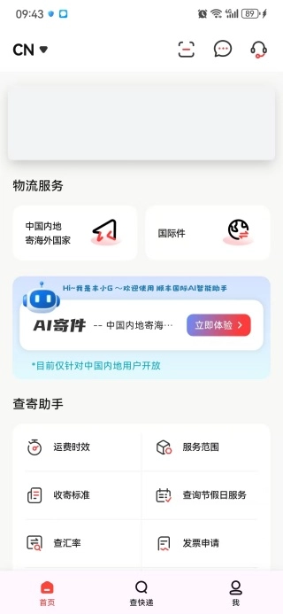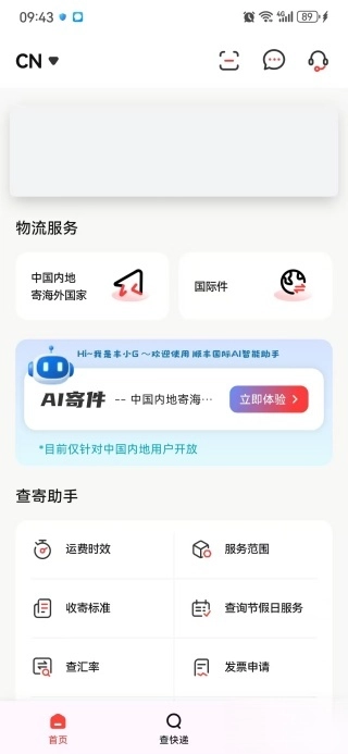 打开软件进入主界面后,即可使用物流服务、查寄助手等便捷功能。