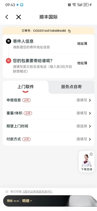 点击寄件功能后,您可以在此填写个人信息,系统提供上门取件和服务点自寄两种服务选项。