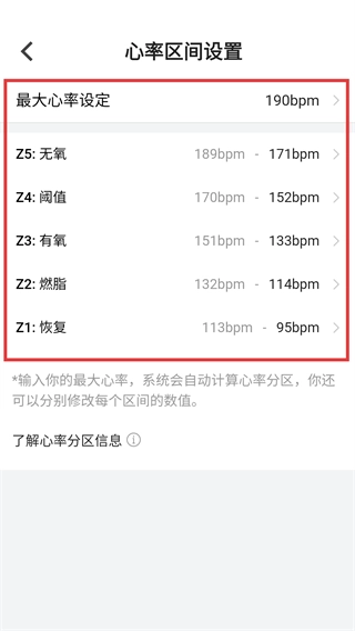 进入【心率区间设置】页面后,能够对【最大心率设定】以及Z1至Z5各个区间的数值进行调整,系统将自动完成分区计算。
