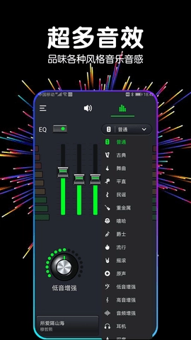 包括音乐均衡器、低音增强器、变声器和放大器,自由调节音效。