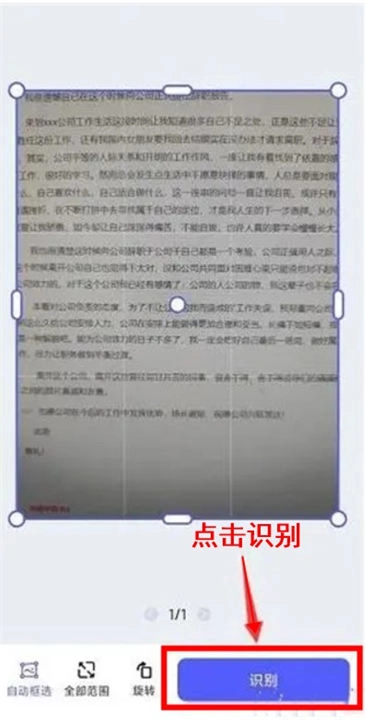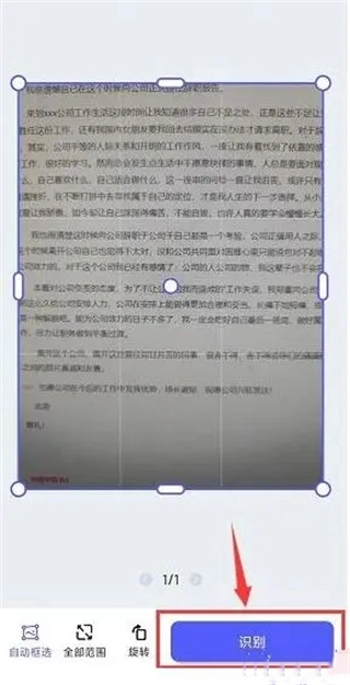 用户能够对图片进行旋转操作,还可以自行划定文字识别的区域,在完成这些选择后,点击右下角的“识别”按钮即可。