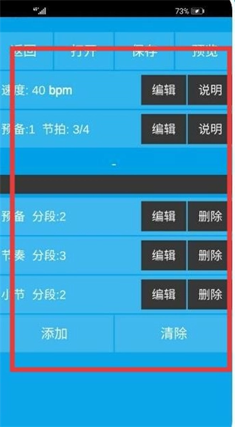 点击对应功能入口进入设置界面,在界面里针对速度、预备节拍等参数,还有各个分段的内容,借助编辑、删除、添加、清除等操作按钮来进行调整与配置,从而完成个性化的设置。