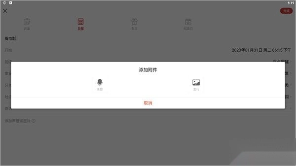 另外,在日程安排里也能点击【添加声音或图片】按钮,以此来添加录音和图片内容。