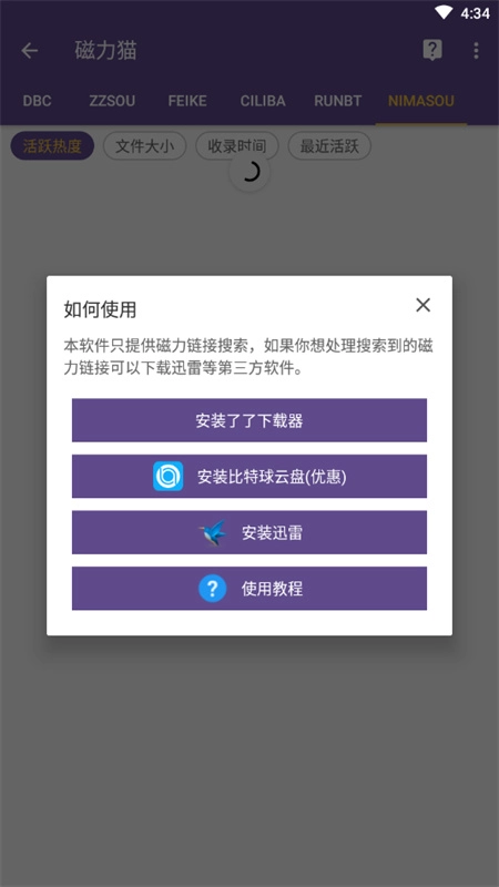 安装后开启应用,简洁界面中央设有搜索框。输入资源关键词后触发搜索,结果页清晰展示文件名、体积及磁力链接。选定资源点击下载按钮,应用自动解析链接并弹出传输窗口,支持迅雷等下载工具调用。