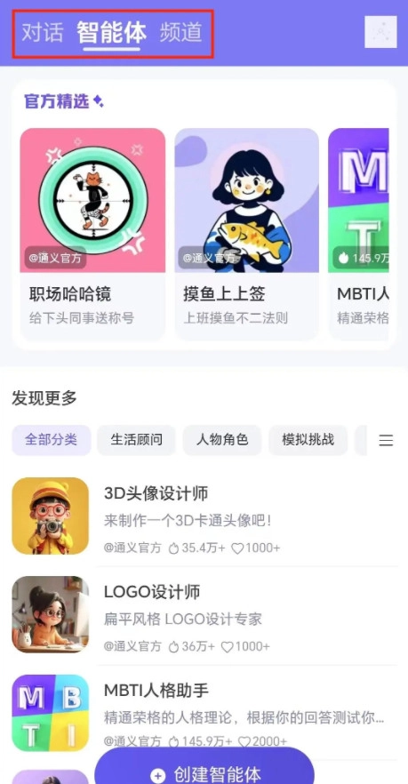 6. 智能体应用:访问智能体页面,选择或创建专业角色,匹配办公或学习需求。