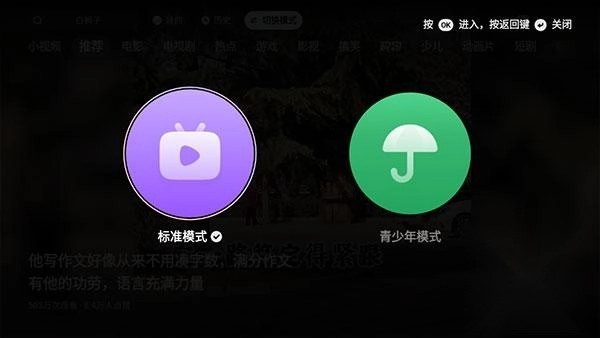2. 选择标准模式或青少年模式