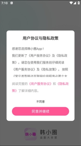 同步韩国电视台更新,及时提醒用户追看新剧集。1、打开韩剧TV后阅读隐私政策和用户协议,点击同意进入软件;