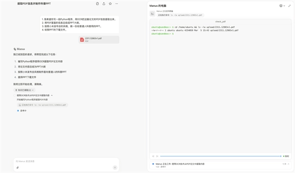 3、输入任务需求:在对话框输入具体指令,例如“写一段Python程序,用OCR提取PDF信息制作PPT”。数据分析任务可上传CSV、JSON或Excel文件,并设定分析目标。