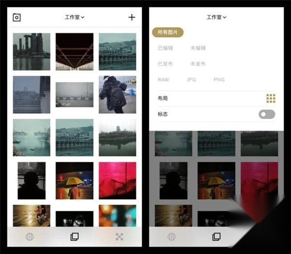 2、作品管理:工作室页面默认展示创作内容。点击顶部切换视图模式,长按预览单张作品,双击进入编辑详情页。