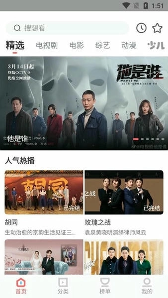 分类页面浏览电影、电视剧、综艺等专区,点击封面进入播放页直接观看。