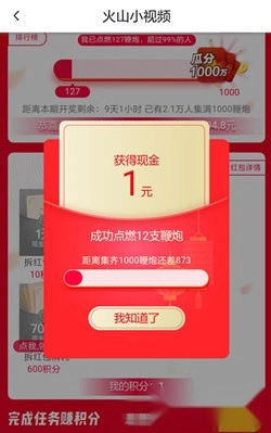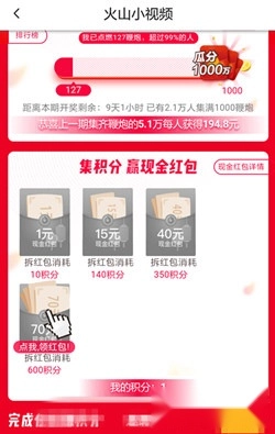 5、在"火山春节送红包"页面,每10积分可兑换1元现金,兑换后可直接提现至微信零钱。