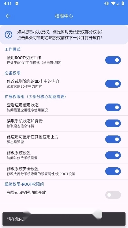 开启root权限:用户板块进入"权限中心",启用"使用root权限工作"开关解锁高级功能。