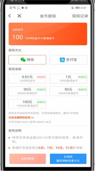 3. 选择提现到的账户及提现金额后点击立即提现即可